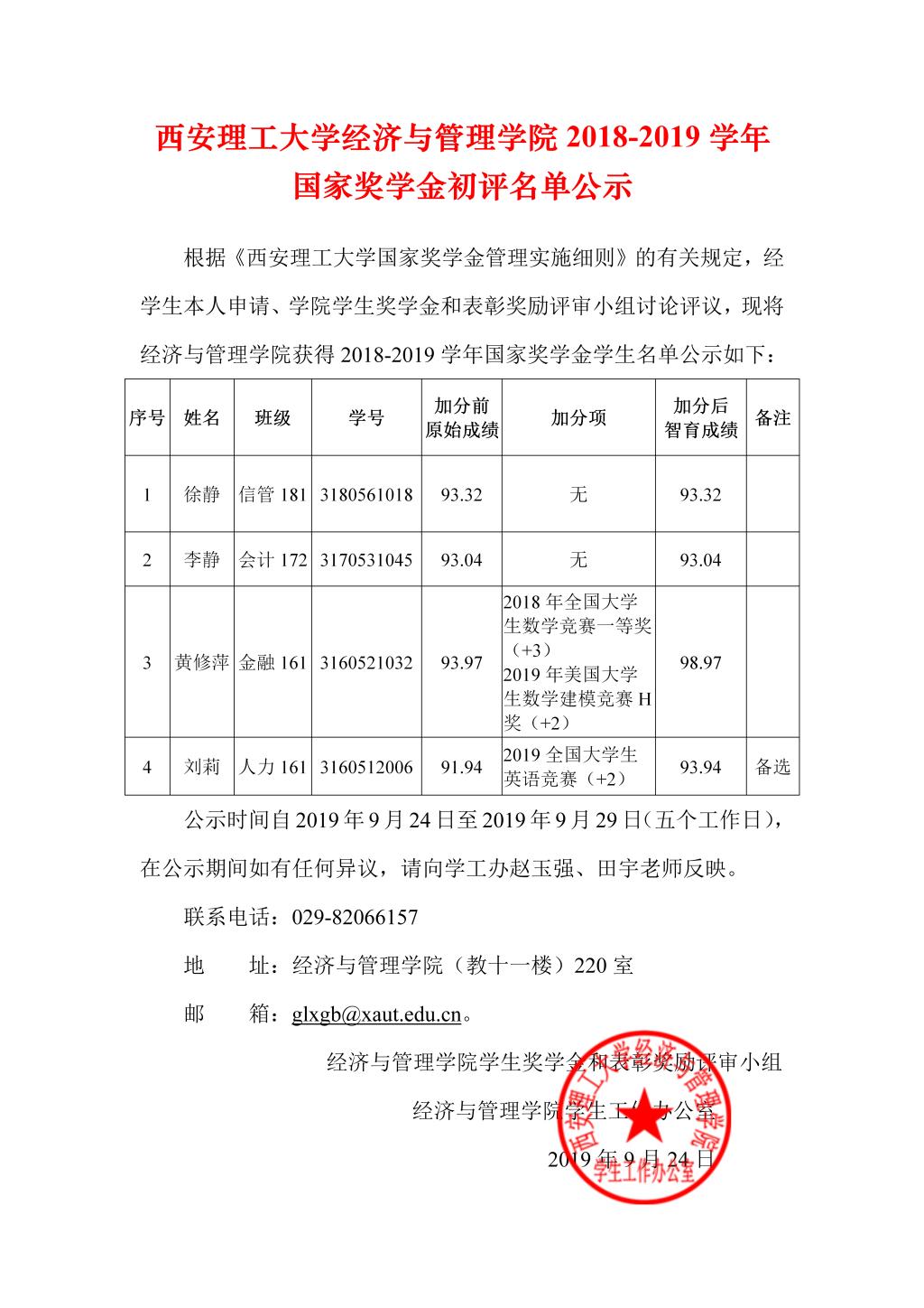 9728太阳集团2018-2019学年国家奖学金初评名单公示
