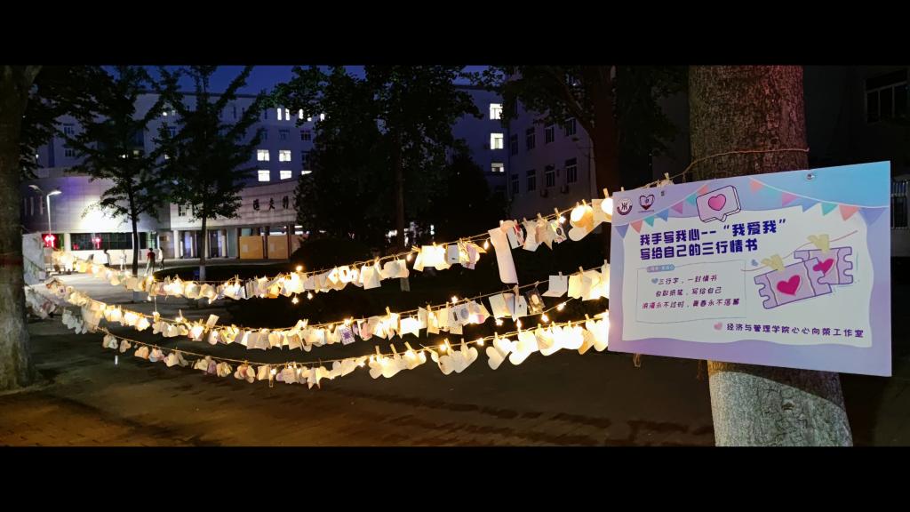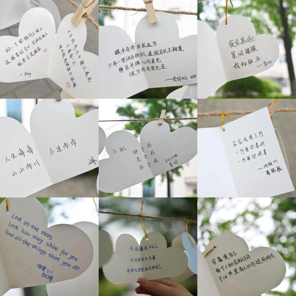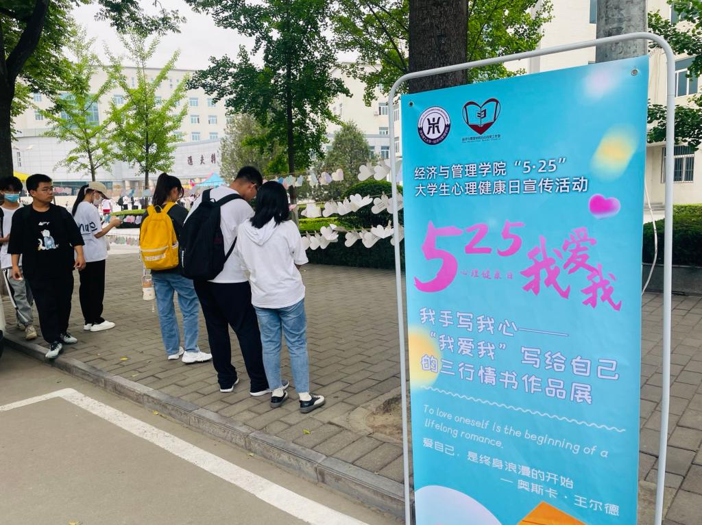 为了培育老员工自尊自信、理性平和、阳光向上的积极心态,营造良好的心理育人校园氛围,5月25日—6月5日,9728太阳集团在曲江校区一期主干道举办了“我手写我心——‘我爱我’写给自己的三行情书”心理健康季主题宣传活动。