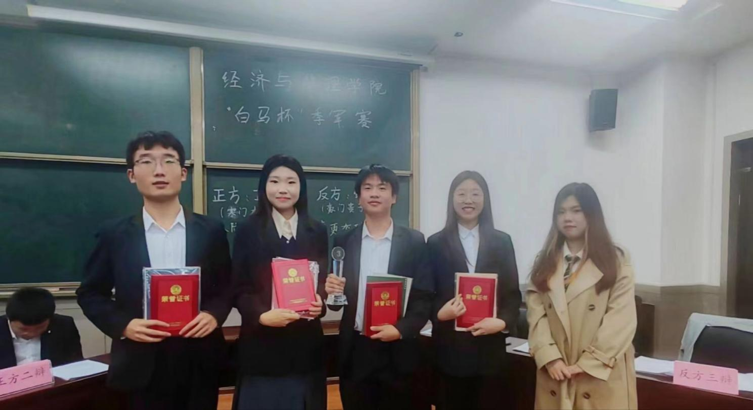 比赛结束,三位评委一一点评,王森田对双方选手表示肯定,说到相比于之前的比赛,同学们都成长进步了很多,林妍菁和唐燕芬指出了赛场上出现的问题和表现较好的地方。最终,主席公布结果,反方四辩江子健同学摘得“最佳辩手”称号,由野火衿声辩论队副队肖楚睿颁奖。经济231获得了本次辩论赛的胜利,拿下“白马杯”辩论赛季军,由野火衿声辩论队队长贺茜对其进行颁奖。