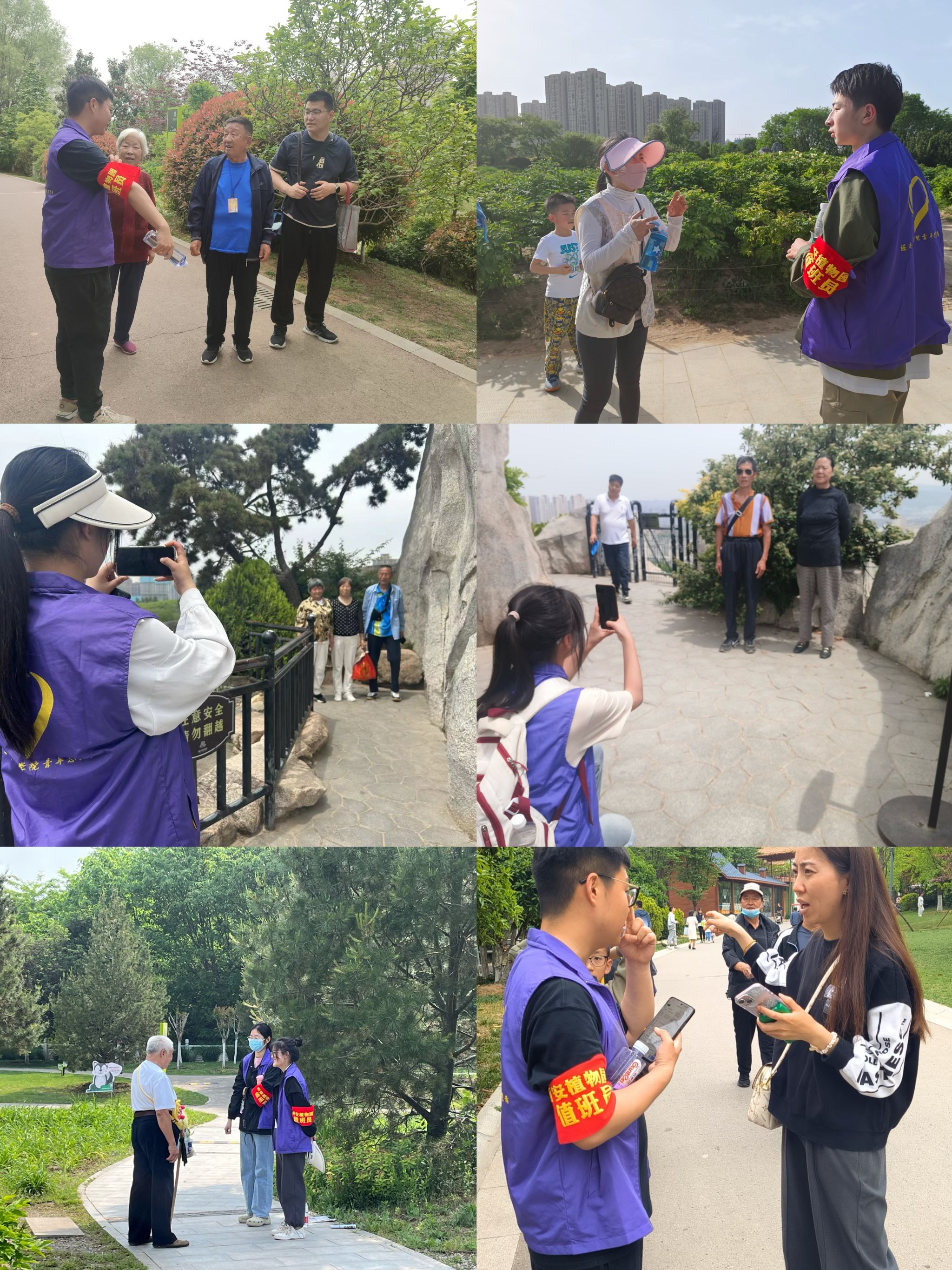 此次志愿服务为期月余。学院每周进行志愿者招募,于清明假期、五一假期、四月至五月每周末组织志愿者前往西安植物园,旨在通过志愿力量,优化旅游服务,减轻假期旅游压力,同时倡导文明旅游,保护植物园的生态环境。服务中,志愿者们穿梭在植物园的每一个角落,他们耐心地为游客答疑解惑,为游客拍摄旅游照片,同时制止园内踩踏花草等不文明行为。旅游咨询、协助购票、维护秩序,这些岗位上都有紫马甲的身影。在阳光的照耀下,他们的身影显得格外耀眼,成为了植物园内一道亮丽的风景线。他们的行动不仅是对旅游环境的维护,更是擦亮了西安植物园这张西安旅游名片。