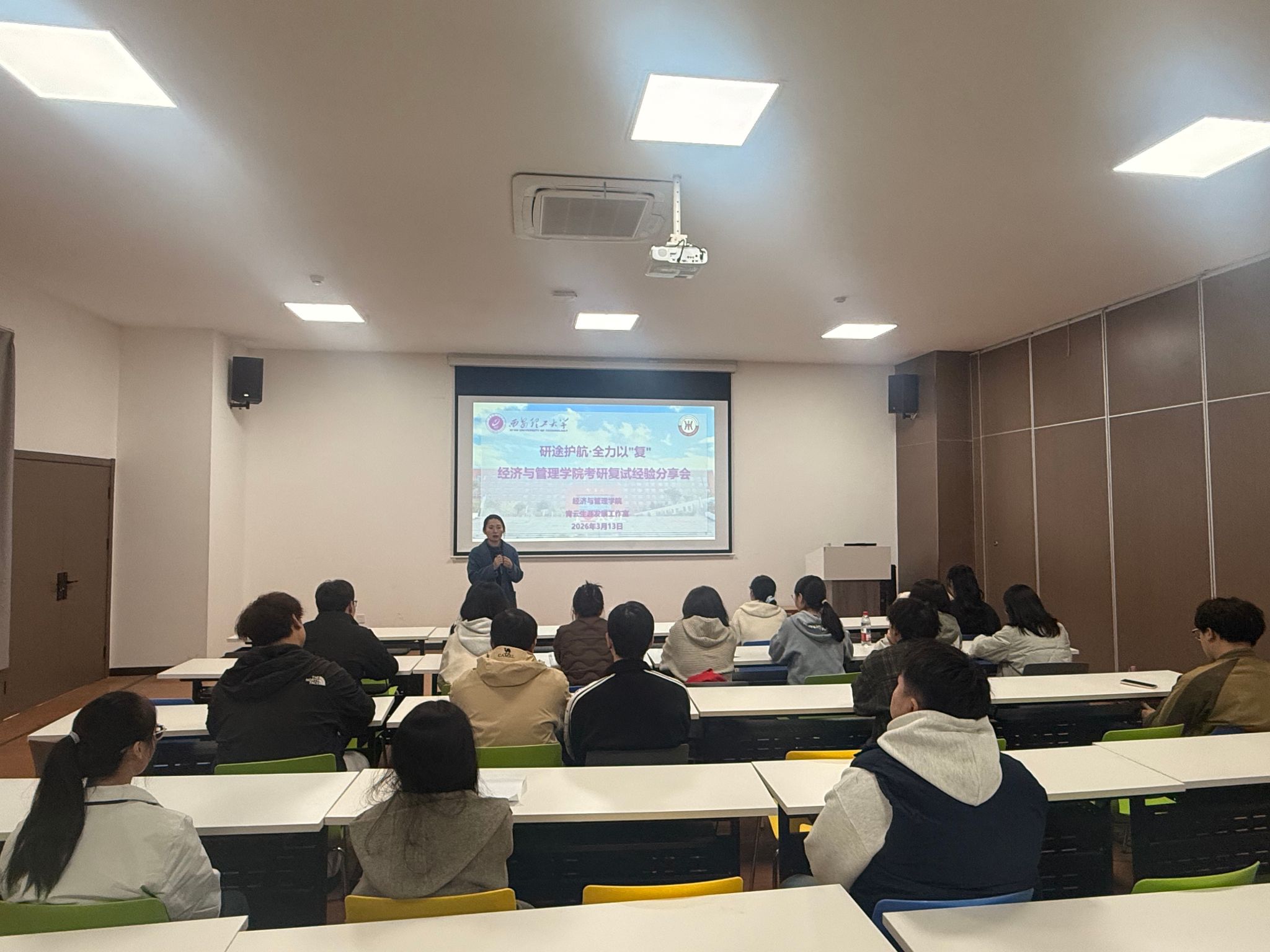 在经验分享环节,任凯、杜雨彤、崔灿三位优秀研究生依次登台,他们结合自身备考与复试实战经历,围绕复试流程拆解、专业课备考技巧、综合面试应答策略、英语口语提升、复试礼仪规范等核心内容,展开细致全面的分享,针对复试高频问题、易错细节给出实用建议,为在场学子理清备考思路、明晰复习方向。