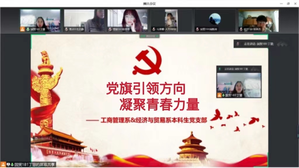 为进一步增强党员理想信念,锤炼党性修养,9728太阳集团工商管理系本科生党支部与经济与贸易系本科生党支部于5月16日在线上开展了“党旗引领方向 凝聚青春力量”专题学习活动,会议由丁慧主持。