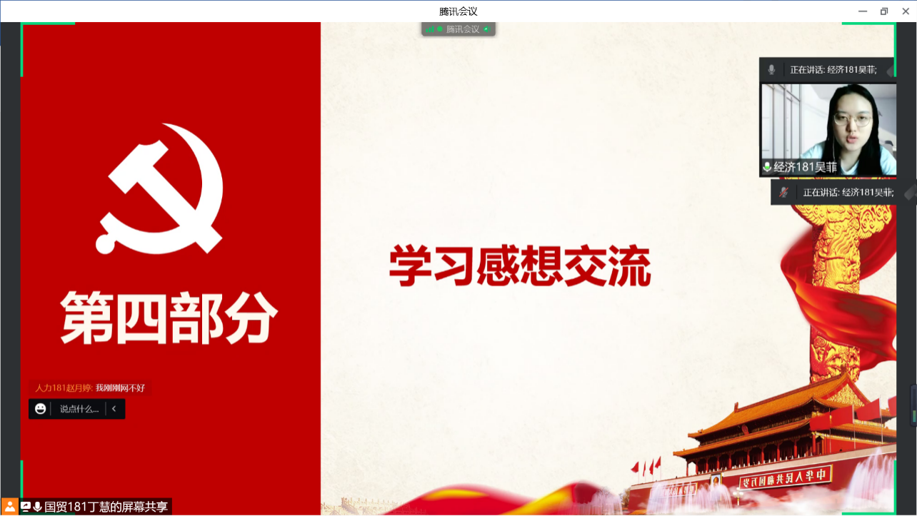 活动中,丁慧带领全体党员同志认真学习了《中国共产党支部工作条例(试行)》、习近平总书记在庆祝中国共产主义青年团成立100周年大会上的讲话以及在中共中央政治局常务委员会会议上对当前新冠肺炎疫情防控形势的分析。学习过程中,各位党员仔细聆听、积极思考,并结合自身学习生活实际展开讨论交流。工商管理系本科生党员马瑜同志表示,新时代的中国青年要更加自信自强、富于思辨精神,在面临各种社会思潮的影响时,能够辨清方向,做出正确坚定的选择。经济与贸易系本科生党员吴菲同志表示,青年党员要把对祖国血浓于水、与人民同呼吸共命运的情感贯穿学业全过程,尤其在抗疫期间,更要保持应有的闯劲、锐气和担当,把自己的小我融入祖国的大我、人民的大我之中,与时代同步伐、与人民共命运。
