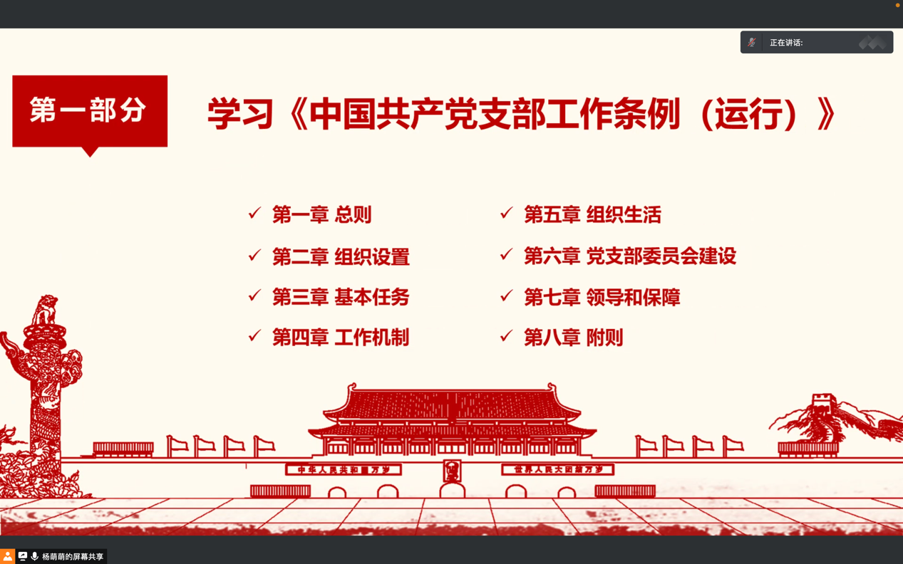 会议伊始,同学们一同观看了“习近平总书记在中国共产党成立100周年庆祝大会上讲话”的视频资料。习近平总书记在讲话中指出,在历史新起点上,中国共产主义青年团要高举信仰旗帜,推动新时代青年工作开创新局面。随后,同学们就《中国共产党支部工作条例(试行)》展开了认真学习,参会成员对学习内容进行了充分的研讨热议,大家在学习中均有所思、有所悟、有所得。最后,同学们集中学习了“中共中央政治局常务委员会关于对当前疫情防控形势的分析会议”,并就习近平总书记在会议上提到的“统一思想,顽强拼搏、同舟共济、团结一心做好抗疫工作”的要求进行了感悟发言。
