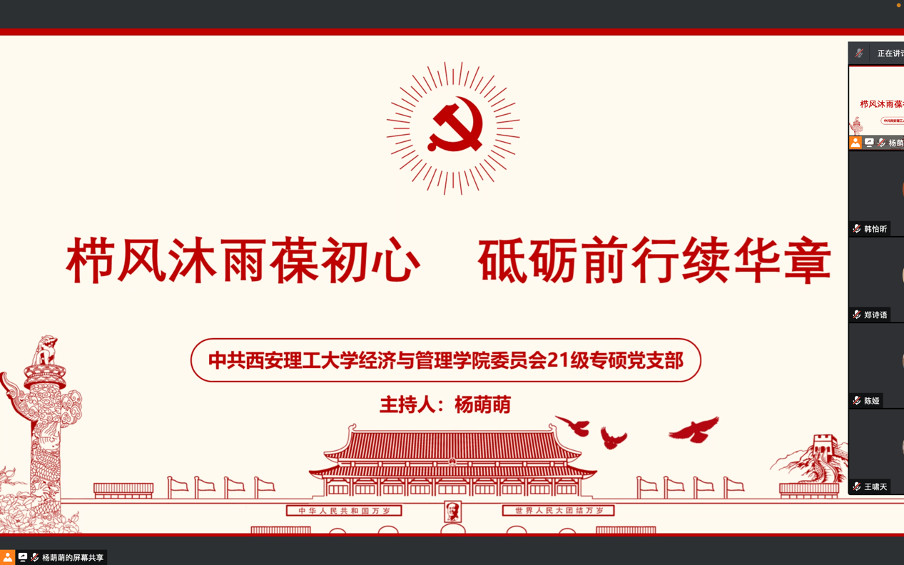 为深入学习党史,汲取奋进力量,9728太阳集团2021级专硕党支部按照公司党委关于开展党史学习教育的安排部署,组织支部全体党员、广大青年团员于5月16日在线上进行“栉风沐雨葆初心,砥砺前行续华章”专题学习活动,会议由支部党员杨萌萌主持。