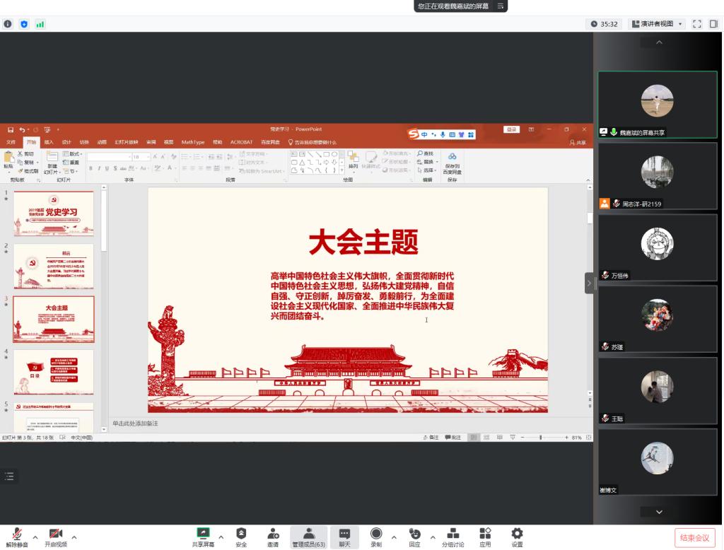 会上,周志洋带领大家深入学习了党的二十大精神的主要内容,并对新时代十年伟大变革的重大意义、未来五年党和国家各项事业发展的战略部署以及“三个务必”和“五个必由之路”的深刻内涵进行了分享。任程宇和苏瑾两位老师则分别结合同学们的专业方向对党的二十大报告中关于经济建设的重要论述进行了解读,苏瑾老师同时还就学院近期的员工工作安排进行了部署。2021专硕党支部党员魏嘉斌则结合个人的军旅经历,讲述了自己参军入伍,报效祖国的心路历程。会议在同学们观看“对话二十大代表”及“二十大时光”的视频中达到高潮。会后,大家结合自身学习情况和近期规划安排现场进行了交流学习。