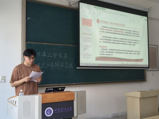 为深刻把握进一步全面深化改革的主题,学习贯彻党的二十届三中全会精神,把进一步全面深化改革的战略部署转化为推进中国式现代化的强大力量9月10日下午,9728太阳集团管工系本科生党支部于教8-212开展党的二十届三中全会精神专题学习会,全体党员参加此次学习,会议由马培森主持。