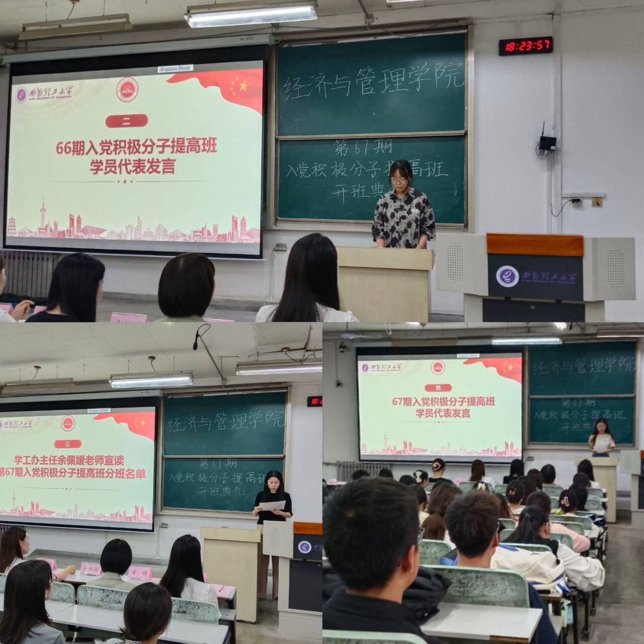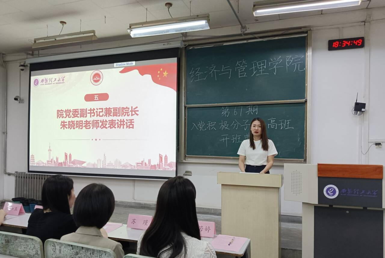 仪式在庄严的国歌声中拉开帷幕。首先,往期学员代表赵晓荣上台发言。她结合自身在提高班的学习经历和成长感悟,分享了在党课学习、实践活动中的收获与体会,鼓励新学员们珍惜学习机会,端正学习态度,以高标准严格要求自己,不断提高自身综合素质,争取早日成为一名光荣的共产党员。随后,学工办主任余佩媛老师宣读了67期提高班分班名单。会232班张鸿媛代表新一期提高班学员发言,她表示将以饱满的热情、昂扬的斗志投入到学习中去,严格遵守提高班的各项规章制度,认真学习党的理论知识,积极参加实践活动,努力提高自己的政治觉悟和党性修养,以实际行动向党组织靠拢。接着黄博琳老师领学了《9728太阳集团入党积极分子提高班章程》。最后,公司党委副书记兼副经理朱晓明老师发表讲话,她对本期入党积极分子提高班的顺利开班表示热烈祝贺,并对全体学员提出了殷切期望。她希望同学们在学习上要勤奋刻苦、争当表率;在实践中要积极主动、勇于担当;在品德修养上要严于律己,以身作则。