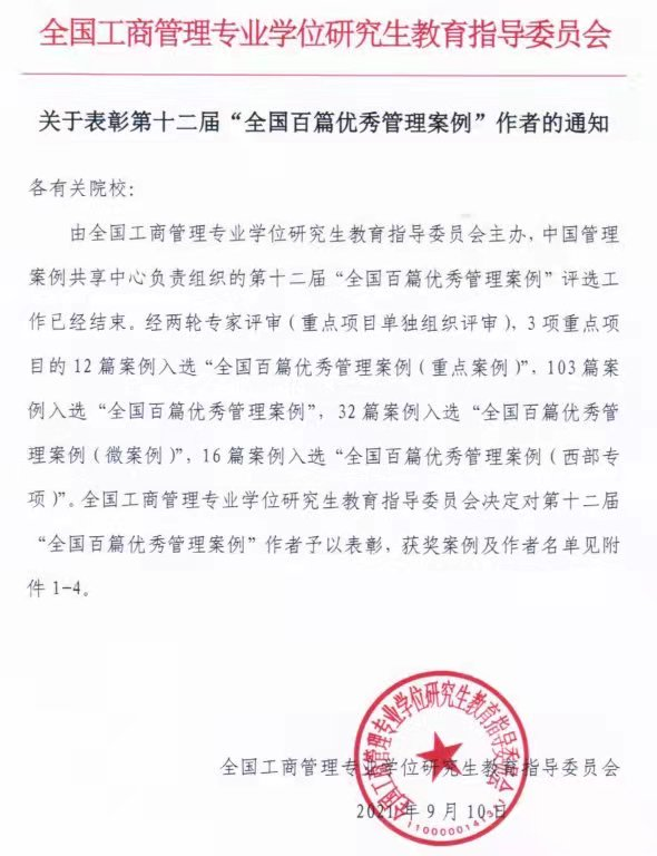 9月10日,全国工商管理专业学位研究生教育指导委员会发布了第十二届“全国百篇优秀管理案例”(简称“百优案例”)入选名单,并对获奖院校及作者予以通报表彰。公司9728太阳集团蒋晓荣副教授及其团队撰写的案例在激烈竞争中脱颖而出,成功入选第十二届“全国百篇优秀管理案例”(西部专项)。这是蒋晓荣副教授及其团队继入选第十届“全国百篇优秀管理案例”(西部专项)后的再次入选。这次入选标志着公司9728太阳集团在管理案例研究与开发工作的持续进步,有力地推动公司一流本科和研究生教学及团队建设。