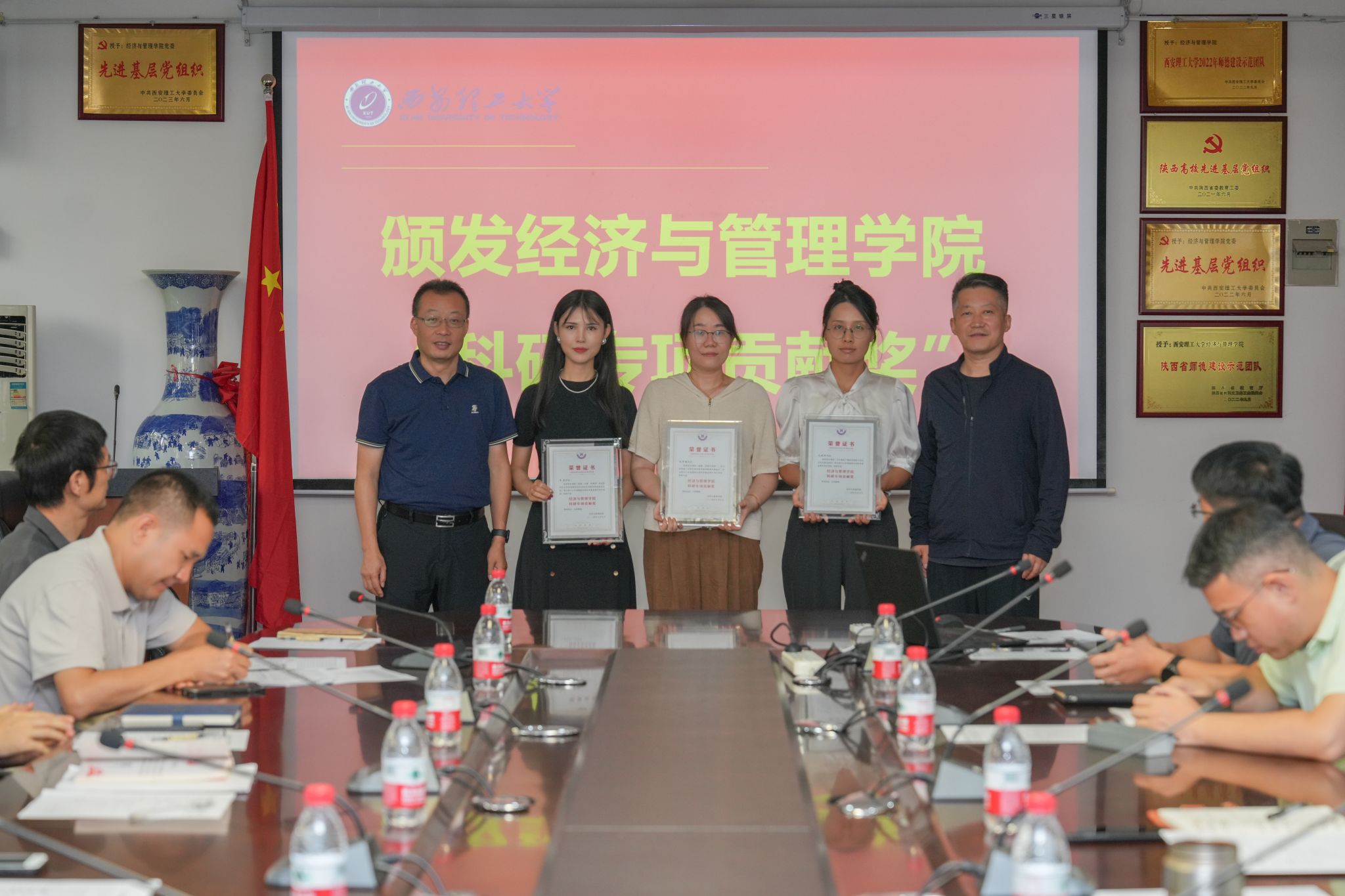 党委书记周晓辉和经理胡海青为获得2024年度国家自然科学资金项目资助的三位教师颁授了“科研专项贡献奖”奖牌并合影留念。三位获奖教师也分别谈了“两个转变”历史机遇下青年教师的责任与担当。经理胡海青在总结讲话中表示,青年教师是学科的未来,更是学院的未来,经管学院办学历史悠久、底蕴深厚,希望青年教师们接续奋斗,在西理工、在经管学院这片沃土上,厚植家国情怀、做好育人工作、成就精彩人生。