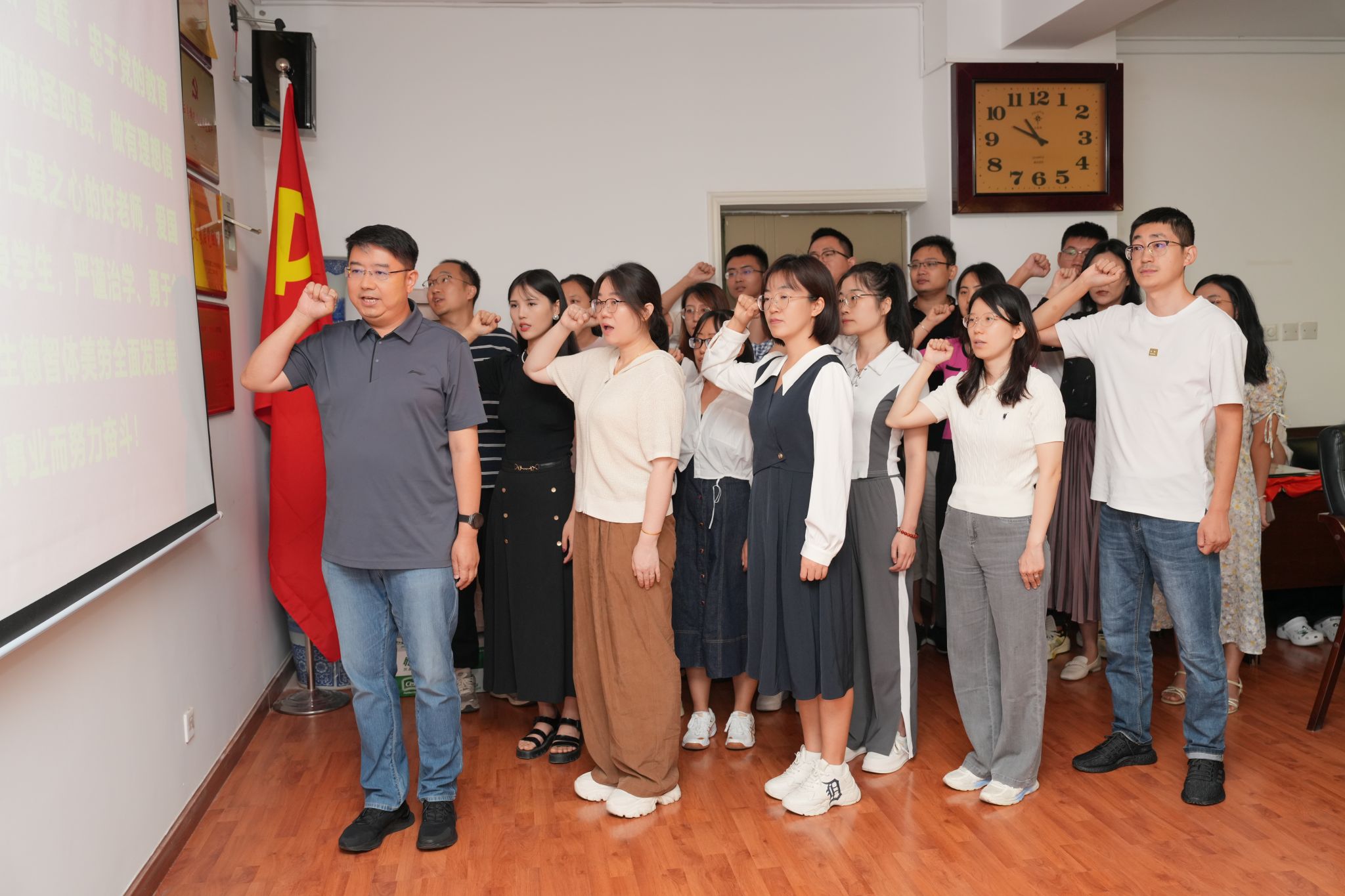 与会老师们重温了学院“砺学弘商宣传片”的精彩片段,更加坚定了“正心修身·砺学弘商”的办学使命。工会主席甘凯带领近三年新进教师做入职宣誓,“甘守三尺讲台,争做‘四有’老师”已是他们的毕生信念。教师代表杨水利从职业感想、育人使命、科学研究三个角度分享了自己从教37年来的体悟收获,“立业正当其时,立足现实情景解决真问题”是他对青年教师的殷切寄语。