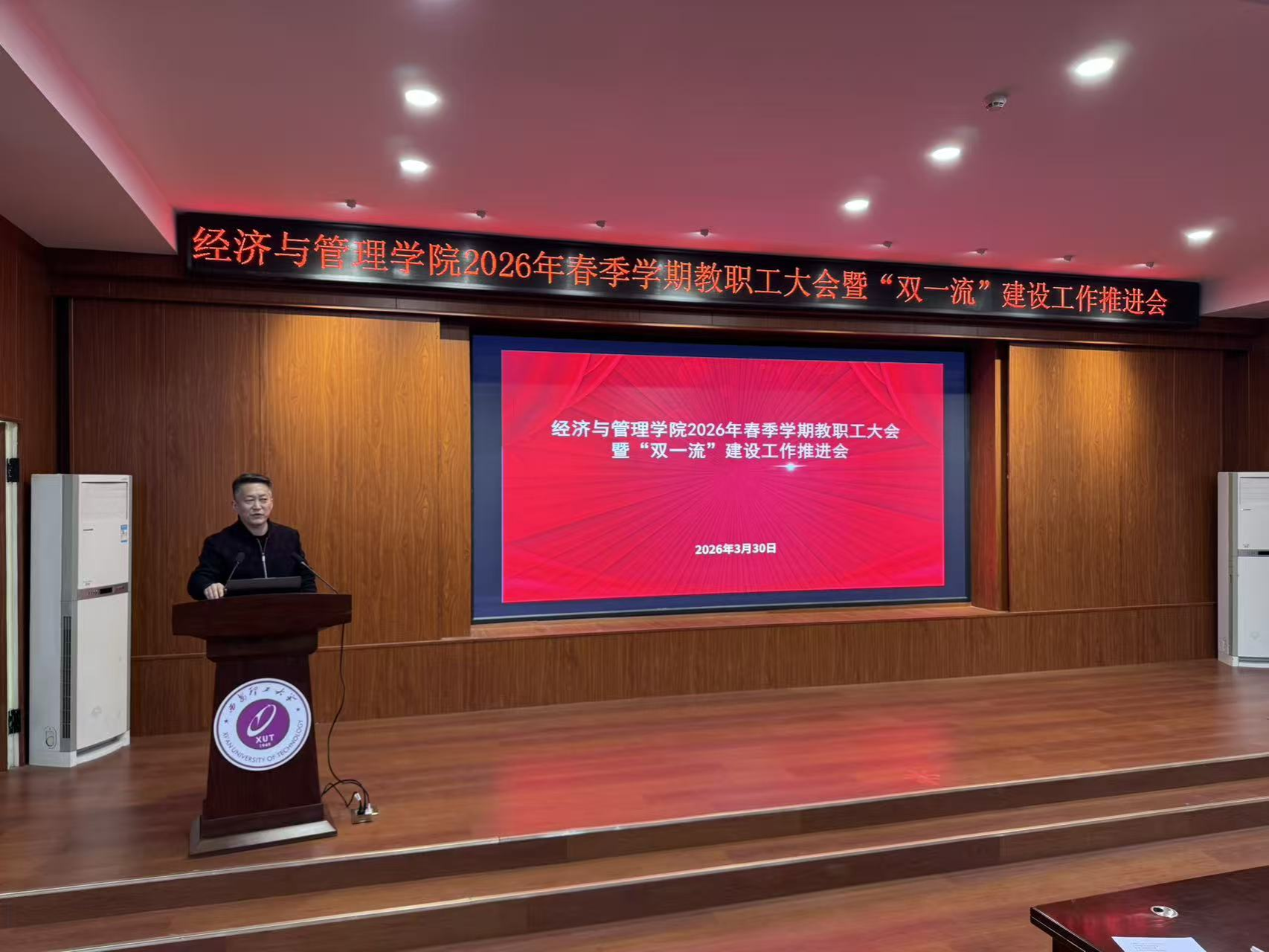 2026年3月30日下午,9728太阳集团在人文学院模拟法庭召开2026年春季学期教职工大会暨“双一流”建设工作推进会。学院领导班子成员及全体教职工参加会议,会议围绕贯彻落实中央和陕西省关于高等教育与就业工作的决策部署,系统总结阶段性成果,部署下一步重点任务。