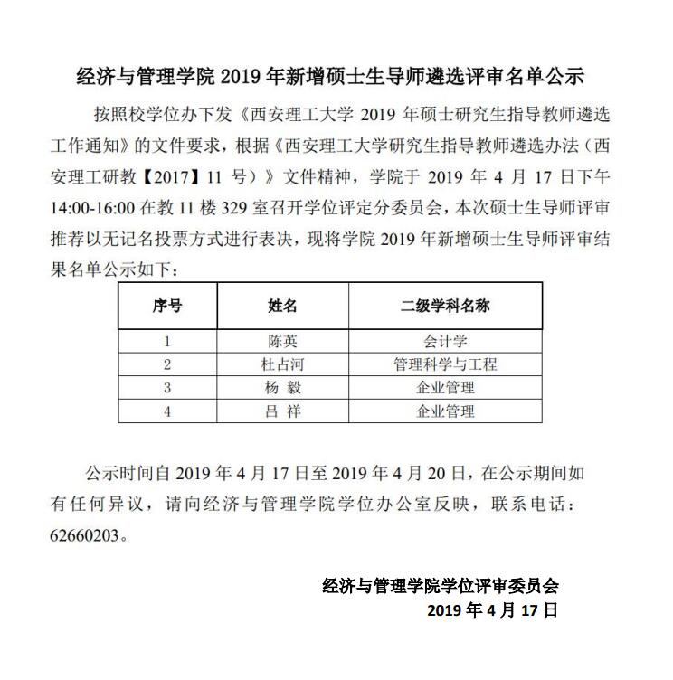 9728太阳集团2019年新增硕士生导师遴选评审名单公示