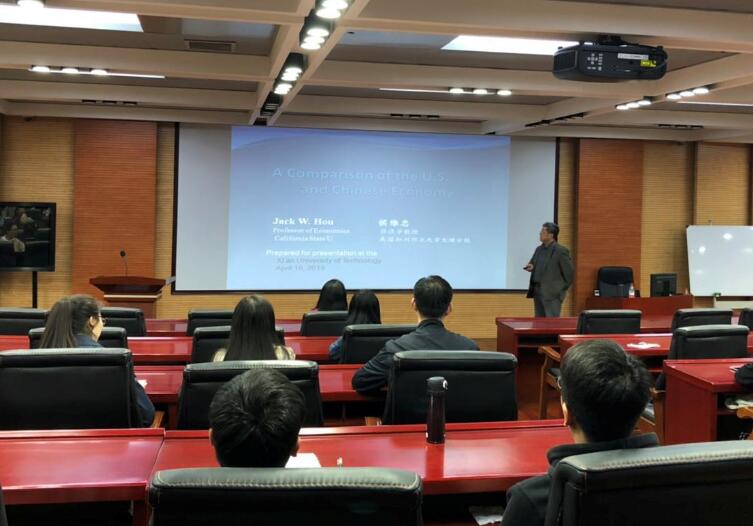 2018年4月16日,美国加州州立大学长滩分校Jack. W. Hou 教授应邀来访经管学院,并在教11楼四层EMBA报告厅做了题为“中美两国经济合作及比较”的学术报告,学院部分教师、16级-17级研究生参加了本次学术报告。