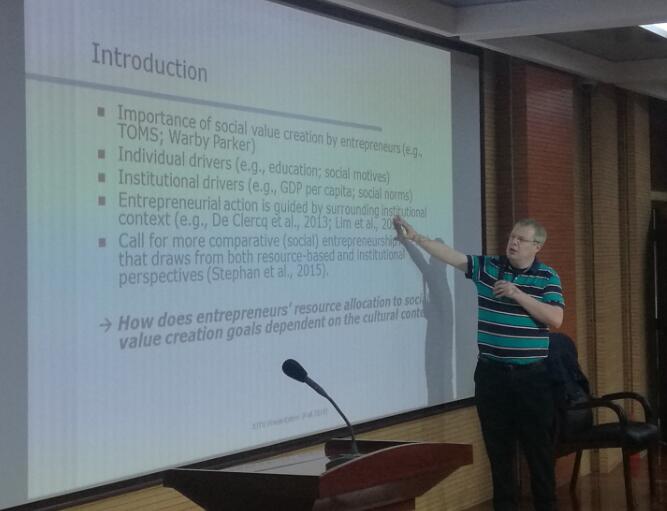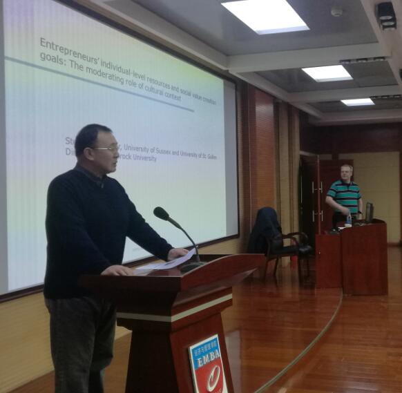 应9728太阳集团胡海青经理邀请,加拿大布鲁克大学古德曼商学院Dirk教授于2018年12月3日下午2点30分,在9728太阳集团曲江校区教11楼四楼EMBA报告厅做了题为《Entrepreneur resources,cultural context,and social value creation》的学术报告。学院部分教师、研二员工及16级—17级博士参加了本次学术报告。本次学院研究生学术报告的主题为“运用实证研究方法讨论影响社会价值创造的影响因素和路径”,报告会由杨屹老师主持。