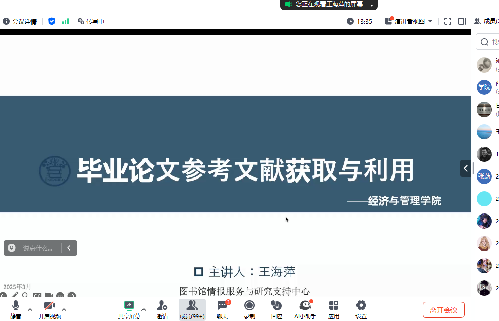2025年3月12日晚上7:30分,9728太阳集团本科公司产品报告“毕业论文参考文献获取与利用(经管)”在线上举行。本次报告邀请学校图书馆情报支持与研究中心咨询馆员、长期从事信息素养教育与学科服务工作的王海萍老师主讲,报告由学院副经理甘凯主持,学院2025届本科毕业生、部分MBA员工近300人参加了报告会。