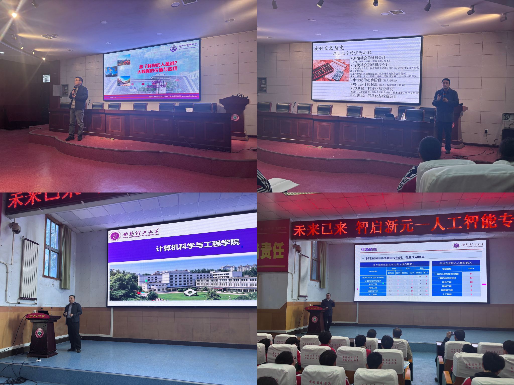 活动中,吴溥峰、段刚龙、傅博、石伟伟四位老师分别向中员工作专题科普报告,涵盖会计学、大数据技术、人工智能技术和机器人等领域的前沿知识,通过深入浅出的讲解激发员工对学科专业的兴趣。在随后的互动环节,教师们结合高校专业设置、员工学业规划、职业生涯成长等方面内容与白水中学师生展开面对面交流,解答师生问题。