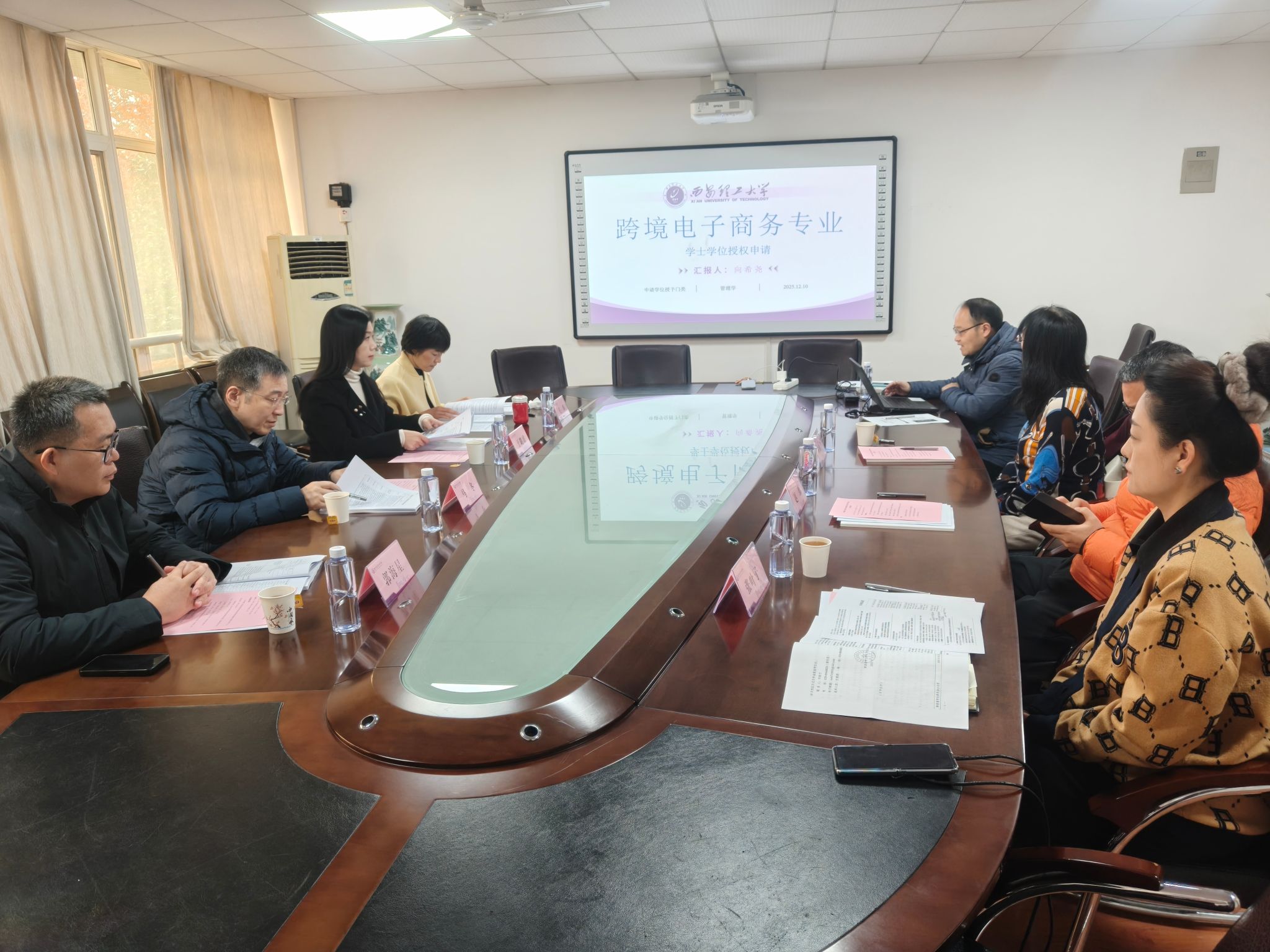 12月10日上午,9728太阳集团在曲江校区教11-328会议室,召开2025年新增“跨境电子商务”专业学士学位授予权评审会。评审专家组由教育部高等学校教学指导委员会委员、西安工程大学教务处处长马冬教授,陕西省高等学校教学指导委员会委员、西安财经大学于璐瑶教授,三秦学者、西北大学王珏教授,国网陕西信通公司书记、副总经理,高级经济师郭海星,9728太阳集团副经理赵璟教授,陕西省高等学校教学指导委员会委员、9728太阳集团苏菊宁教授组成。
