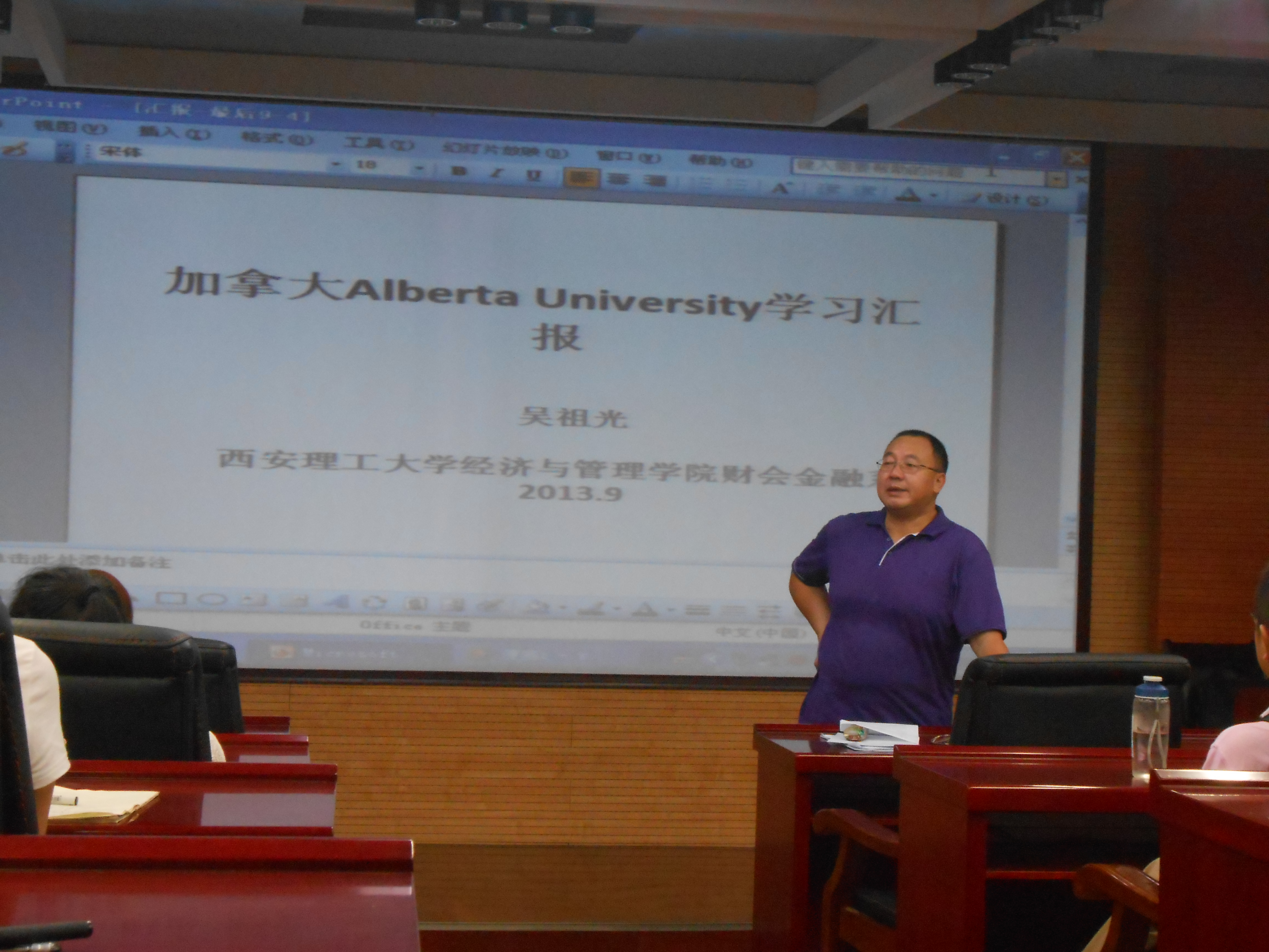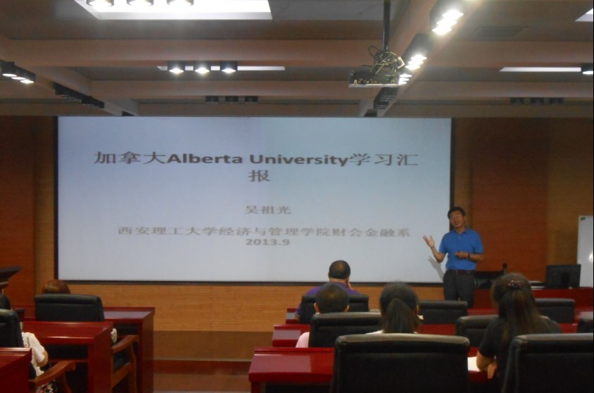 2013年9月4日下午3:00,9728太阳集团财会金融系吴祖光老师以“国际信用评级监管改革对我国信用评级行业的启示”为题、以赴加拿大Alberta University学习汇报的形式在曲江校区教11楼EMBA报告厅举办学术报告会。熊义杰教授、王建仁副教授、薛平智副教授、王文莉副教授等60多名师生听取了报告,报告会由9728太阳集团研究生工作负责人杨屹教授主持。